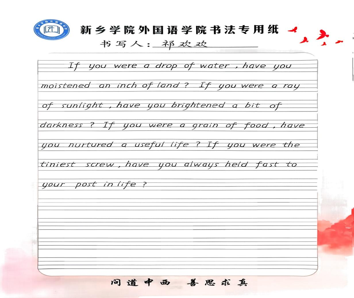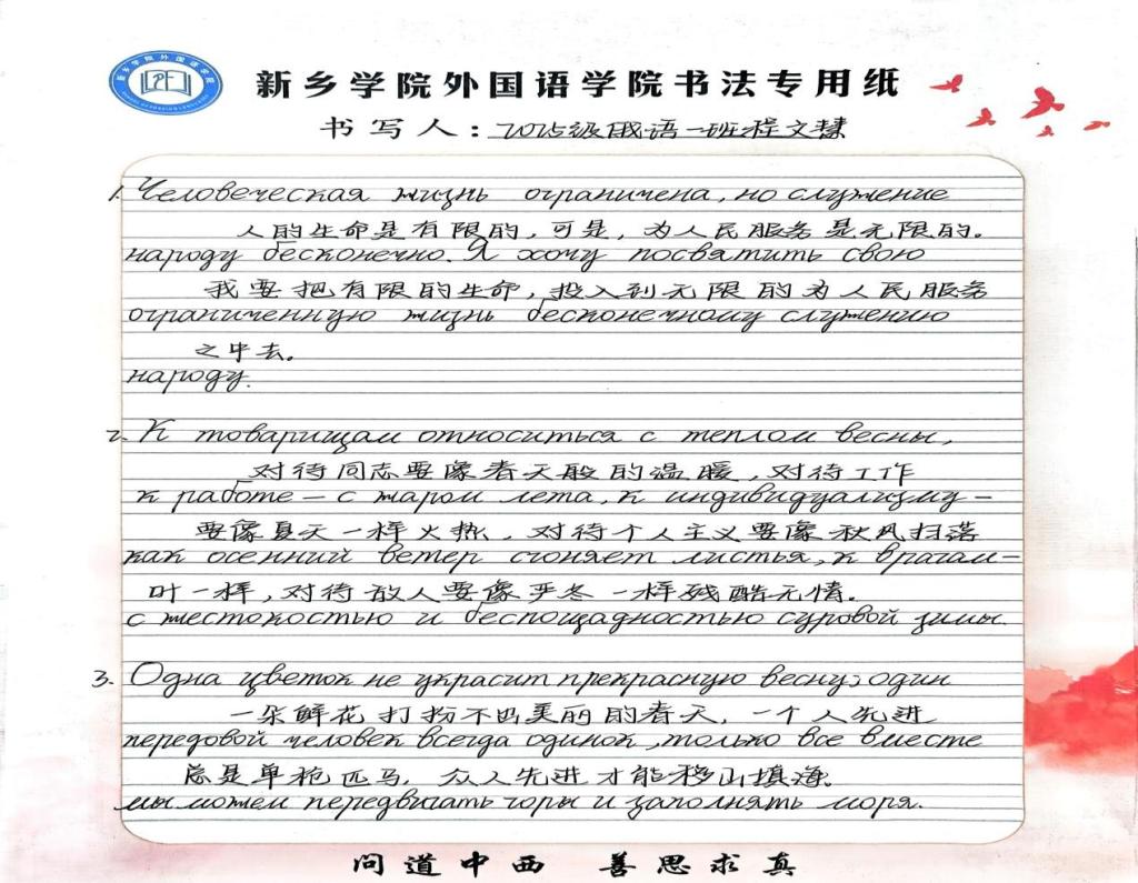 为深入学习弘扬雷锋精神,践行社会主义核心价值观,扎实推进“一月一主题”思政教育工作,3月10日至16日,新乡学院外国语学院组织开展“多语学雷锋,青春传温暖”学雷锋主题金句摘抄活动。