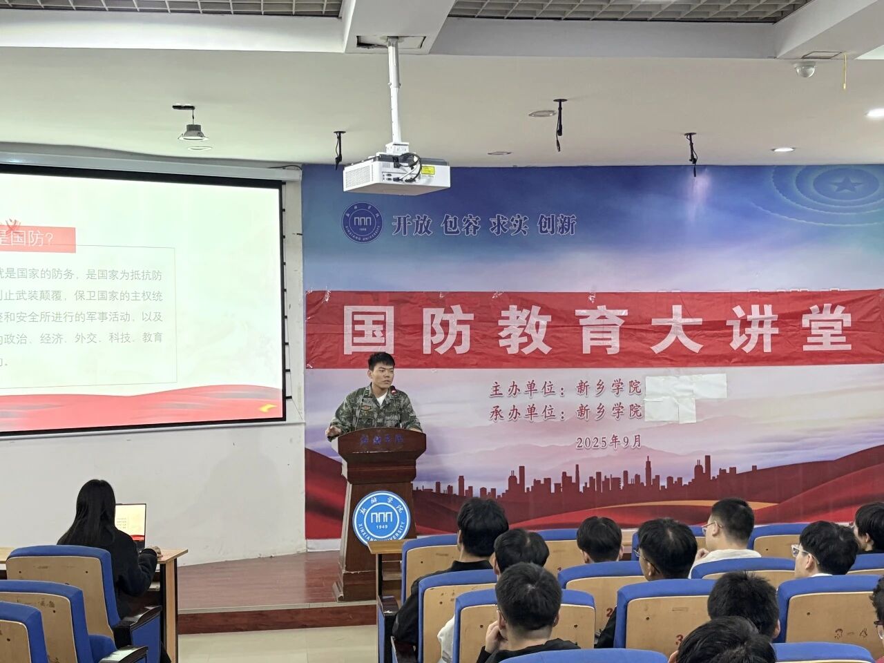 首先,宋佳辉同学以提问的方式了解同学们心中的国防,从而给同学们介绍了国防的内涵,加深了对国防的认识,调动了同学们的积极性。