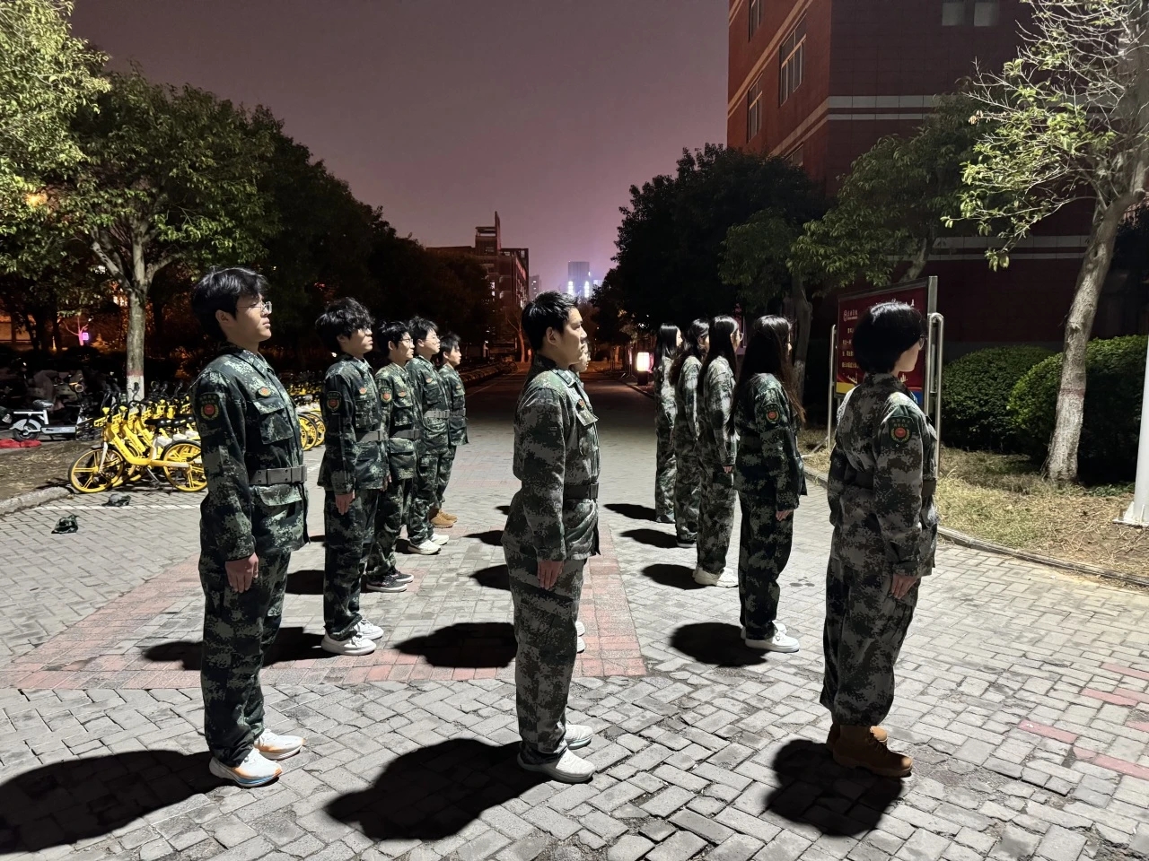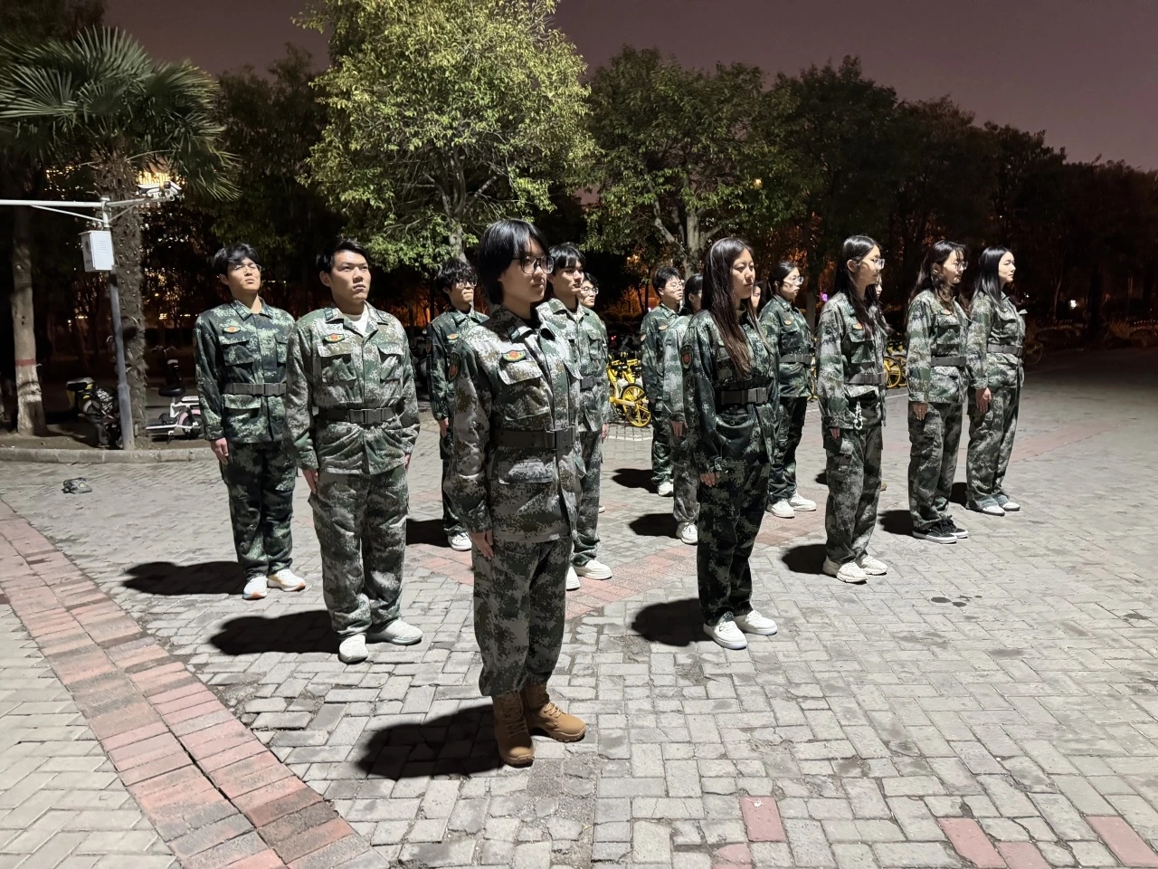 在宣讲结束后,由国防教育教导大队队长刘志宇带领队员进行常规夜间队列训练,队员们统一着装、精神饱满,认真练习齐步走、跑步走、站立、稍息、跨立等基础队列动作,展现出严谨的纪律作风和良好的精神面貌,是学校开展国防教育、强化学生军事素养的真实体现。