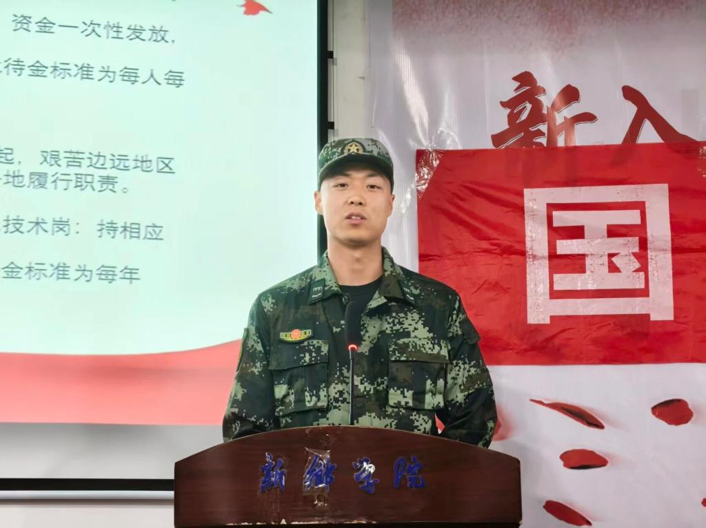 随后,退役大学生段海洋首先播放了一段趣味军营视频,并与同学们互动提问:“如果你是军人,你认为什么样的排班最好?”,拉近了与同学门距离,也让大家直观了解了军旅生活。接着,他结合自身经历,分享了从青涩到坚毅的军营成长蜕变,用真实故事打动了在场同学。他还详细讲解了参军条件、体检标准、役前训练等关键信息,并介绍了参军津贴补助、军队岗位安排,以及学业保障、职业发展等多项优势,内容务实详尽,为有意向参军的同学提供了实用参考。