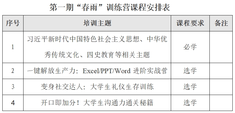 “春雨”训练营旨在做好经济保障性资助的基础上,全面提升学生综合能力、强化学生综合素养。本期训练营主要围绕价值引领、办公技能提升、日常礼仪、沟通技巧等4个模块的内容开展。价值引领为必学模块,其他三项为选修模块,至少选择一个选修模块学习。